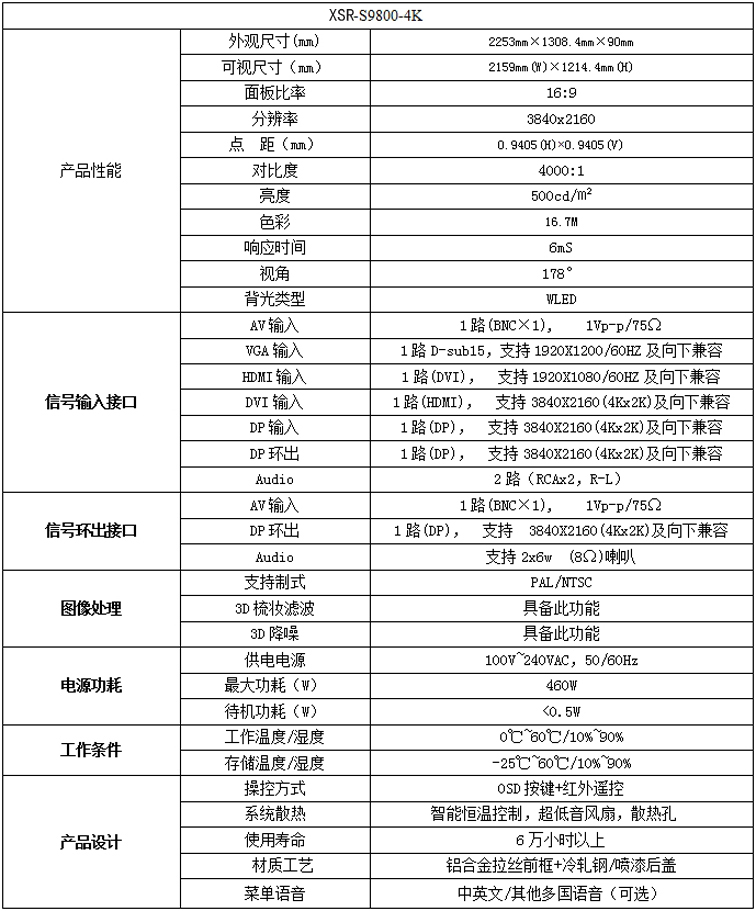 新視銳98寸4倍高清液晶顯示器性能參數: