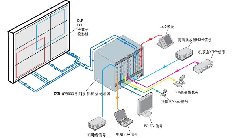 新視銳XSR-WP8000系列多屏拼接圖像處理器典型應(yīng)用示意圖:
