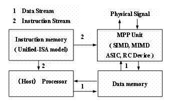 具體對(duì)指令流體系結(jié)構(gòu)來(lái)說(shuō),其SISD、SIMD、MISD、MIMD四類(lèi)體系結(jié)構(gòu)的指令子集合是統(tǒng)一成SISD體系結(jié)構(gòu)的指令集合,對(duì)于數(shù)據(jù)流與構(gòu)令流的體系結(jié)構(gòu)是通過(guò)增加相應(yīng)的指令,統(tǒng)一成SISD體系結(jié)構(gòu)的指令集合的;換句話(huà)說(shuō),圖1中的SIMD、MIMD、ASIC與RC Device四種 MPP Unit都是可以通過(guò)軟構(gòu)件描述的。這些軟構(gòu)件是可以在SIMD或MIMD體系結(jié)構(gòu)上直接執(zhí)行的,或者是可以自動(dòng)映射成ASIC或RC Device電路的。(2)虛擬的并行計(jì)算陣列